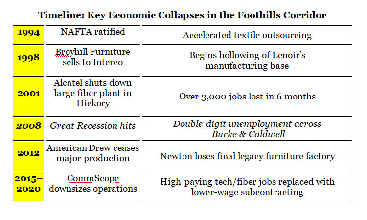 For much of the 20th century, the Foothills Corridor was a crucible of American industry. This 20-county stretch of western North Carolina, anchored by cities like Hickory, Morganton, Lenoir, Statesville, Winston-Salem, North Wilkesboro, Gastonia, and Marion, didn’t just ride the manufacturing wave—it helped define it. If you grew up here, someone in your family likely worked in furniture, textiles, hosiery, fiber optics, or millwork. You didn’t have to leave town to find a living wage. You could build a life with your hands, your back, and your grit.